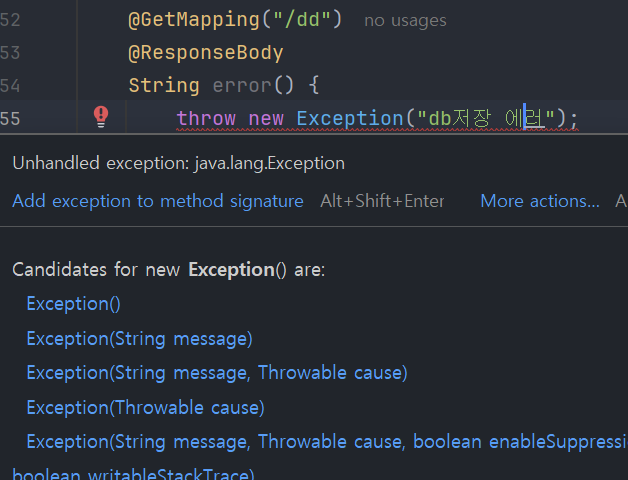 이렇게 위에 @ExcpetionHandler(Exception.class)를 달아줄 시